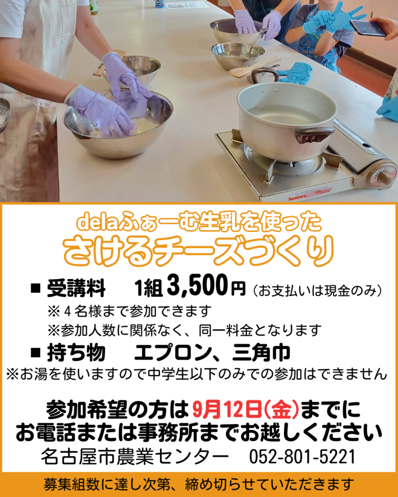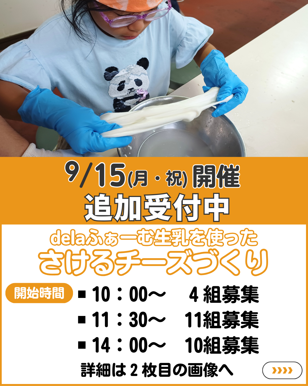 9月15日(月・祝)dalaふぁーむ生乳を使ったさけるチーズ作り 追加受付中! 伸ばすのを繰り返して、さけるチーズを作りましょう! お子さまはもちろんのこと、大人もつい夢中になってしまう教室です。 出来立てのチーズは本当においしいですよ🧀 参加希望の方は9/12(金)までにお電話いただくか、事務所までお越しください😊 (2025.8/23)