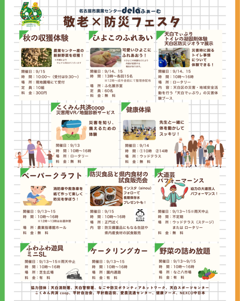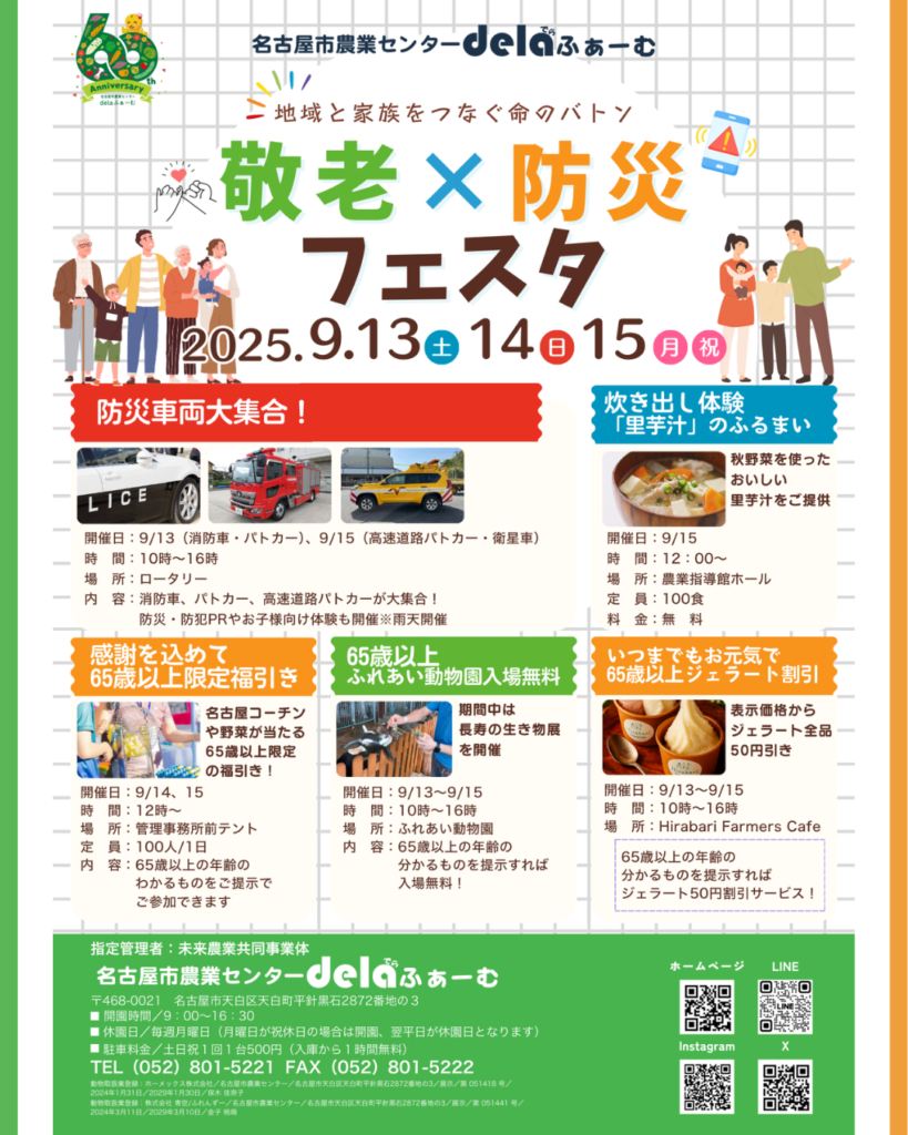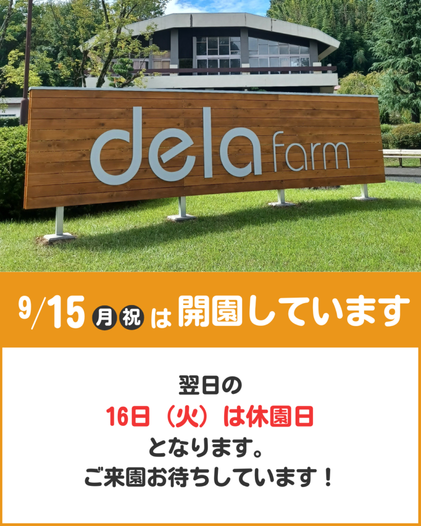 9月15日(月・祝)は開園しています いつも農業センターにご来園いただき、ありがとうございます。9/15(月・祝)は休日のため、開園いたします。9/15は敬老×防災フェスタを開催しています!ぜひお友達やご家族とご来園ください。(翌日の9/16(火)は休園です。)皆さまのご来園をお待ちしています! (2025.9.10)