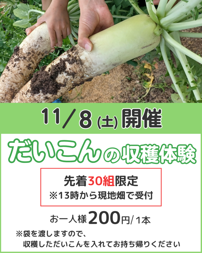 11月8日(土)だいこんの収穫体験を開催 先着30組限定、お一人様1本200円※受付は13時から現地畑 農業センターのみずみずしいだいこんは、だいこんおろしにも、おでんで煮てもおいしいです✨ ぜひご参加ください😊