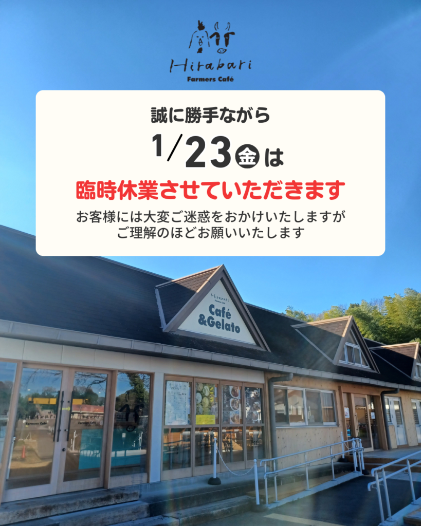 1月23日 Hirabari Farmers Cafe臨時休業のお知らせ 誠に勝手ながら、1/23(金)は臨時休業させていただきます。 お客様には大変ご迷惑をおかけしますが、ご理解のほどお願いいたします。 なお、農業センターは通常通り開園します。 (2025.1/22)