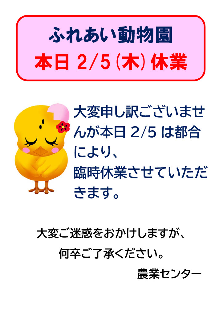 【ふれあい動物園臨時休業のお知らせ】 本日2/5(木)はふれあい動物園は休業させていただきます。 急なご連絡でお客様には大変ご迷惑をおかけいたしますが、何卒ご了承いただきますようお願いいたします。 なお、農業センターは通常通り開園しています。 (2026.2/5)