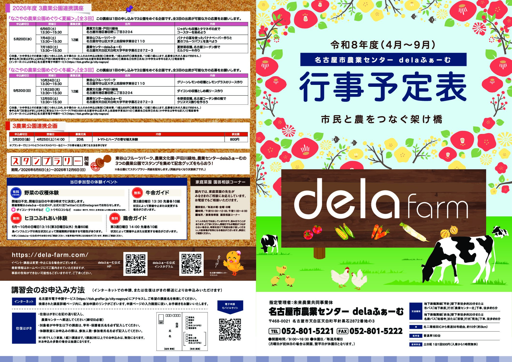 令和8年度(4月~9月)行事予定表 各種講習会の日程や内容などの詳細やお申し込み方法について記載しています。 各区役所情報コーナーや農業センターでも配布しています。 お申し込みは、名古屋市電子申請サービスか往復はがきにてお申し込みください。 (2025.2/10) 令和8年度(4月~9月)行事予定表ダウンロードはこちら